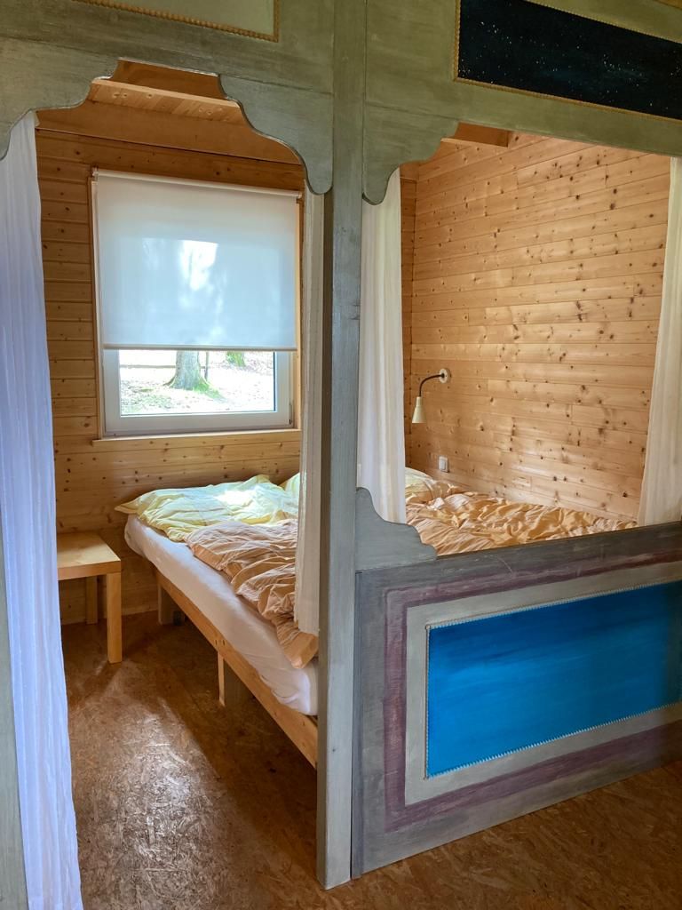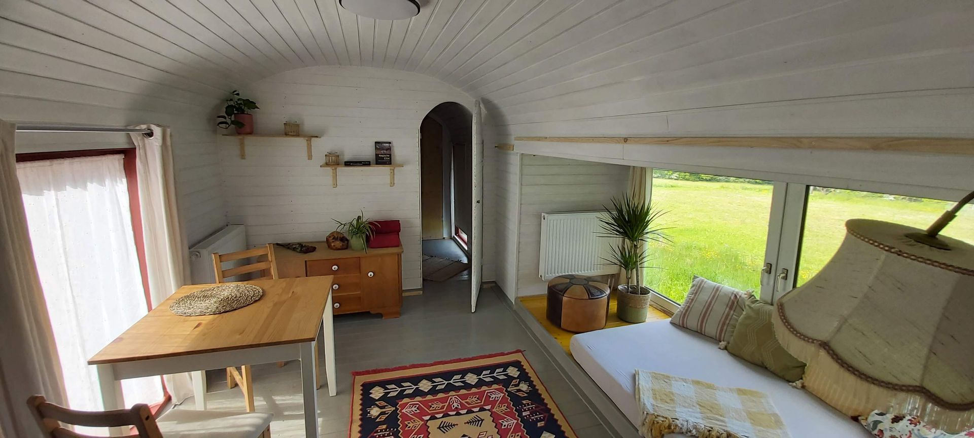 Der Zirkuswagen liegt zwischen Villa Forum und der Teamküche und bietet wundervolle Ausblicke über das gesamte Gelände. Wir haben gerade erst seine Vollsanierung fertiggestellt, der Zirkuswagen bietet ein volleingerichtetes Bad mit Dusche, einen abgetrennten Schlafbereich, einen wundervollen und geräumigen Wohnbereich sowie eine Küchenzeile, in der ihr euch selbst versorgen könnt. Auch eine Terrasse!