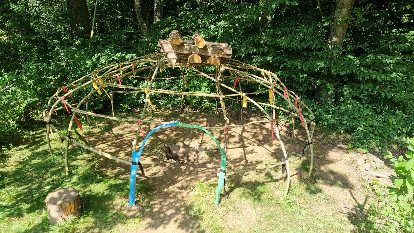 Die Schwitzhütte besteht aus Weidenruten und wird mit Decken völlig abgedeckt.